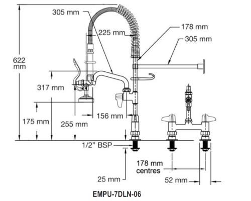 T&S Brass Pre Rinse Units MINI PRE-RINSE/TWIN DECK/FAUCET/LOW FLOW VALVE - EMPU-7DLN-06